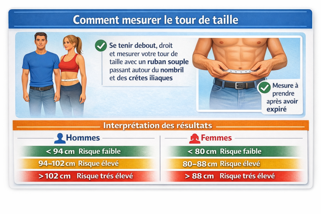 Le mesure du tour de taille fournit une évaluation simple et rapide de votre quantité de graisse abdominale, qui est un bon indicateur de votre risque de développer des problèmes de santé tels que le diabète, les maladies cardio-vasculaires et l’hypertension artérielle.